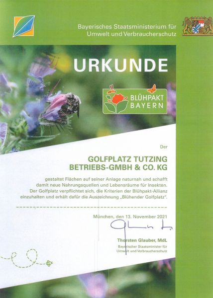 Die Urkunde der Auszeichnung hat Staatsminister Thorsten Glauber am 13.11. in München der Geschäftsführung des Golfplatzes im Rahmen eines Festaktes überreicht. In seiner Rede wies Herr Glauber u.a. auf wissenschaftliche Untersuchungen hin, dass Bewegung und Beobachtungen in der Natur Menschen glücklicher machen und Glück das Immunsystem stärkt. In Bezug auf die Golfanlage in Tutzing würdigte er: Der Golfplatz Tutzing ‚‚befindet sich in einer wunderbaren Lage und schöner Natur. Dort fühlen sich nicht nur die Gäste und Spieler sehr wohl, sondern immer mehr auch Bienen, Schmetterlinge und alle Formen von Insekten. Das liegt an den wertvollen Blumenwiesen, die sie neu angelegt haben... Die Hardroughs werden auch zweimal im Jahr durch Landwirte gemäht und das Mähgut als Futter für die Pferde verwendet... Dafür unseren Glückwunsch und die Auszeichnung zum "Blühenden Golfplatz".